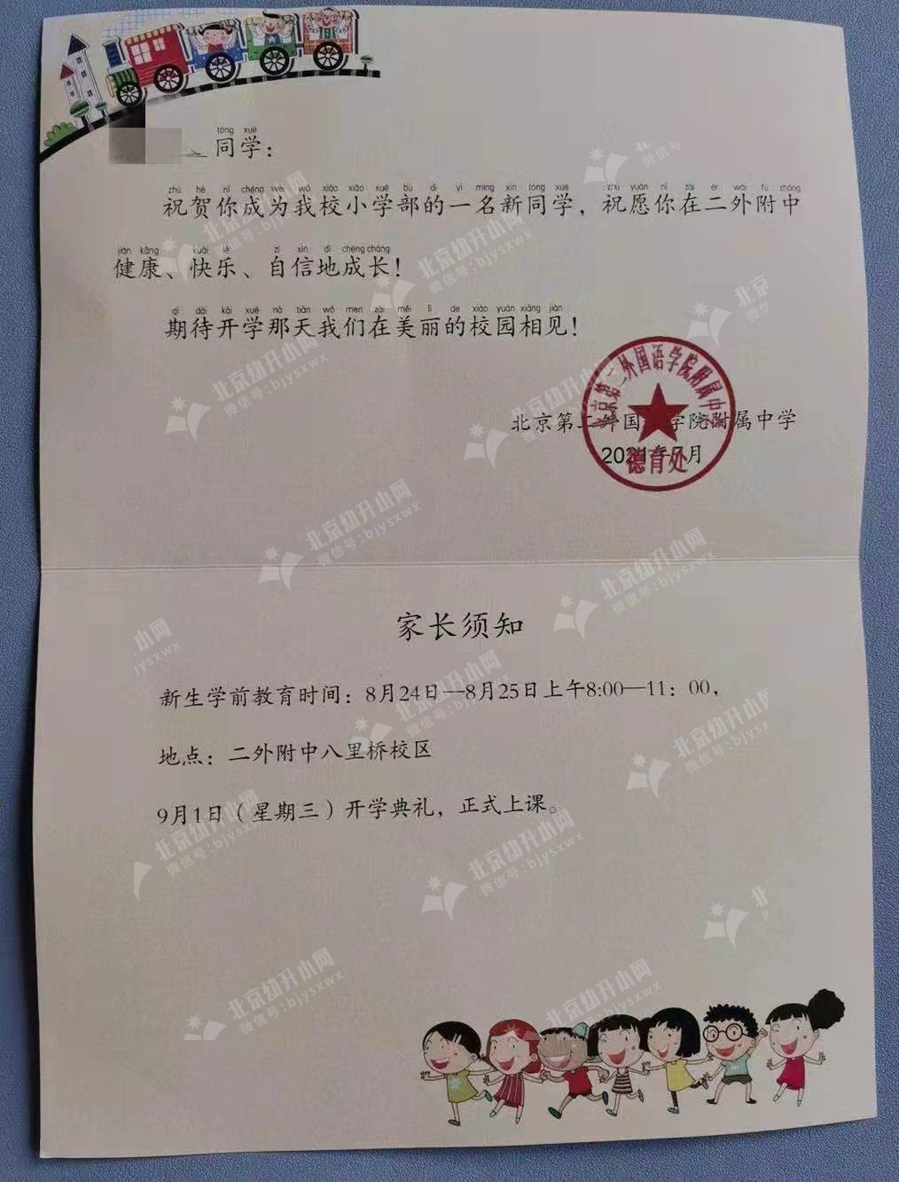 2021年朝阳区北京第二外国语学院附属中学小学部录取通知书公布!朝阳区2021年小学录取通知陆续下发!各位家长您知道2021年朝阳区北京第二外国语学院附属中学小学部录取通知书上有哪些信息?北京幼升小网团队为您分享相关内容。
