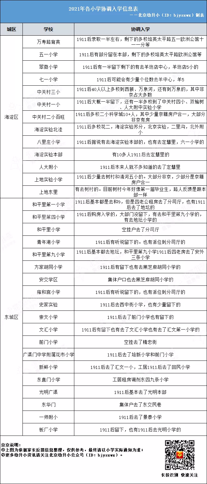 据2021年幼升小家长分享信息,各小学协调入学情况不同,有小学因报名人数超出招生计划进行协调,按北京幼升小网收集信息来看,协调入学一般有四老房产、非京籍等情况,根据2021年家长反馈信息整理部分小学协调入学相关信息,仅供各位家长参考,由于各区各小学情况不一,最终请以入学当年实际要求为准!