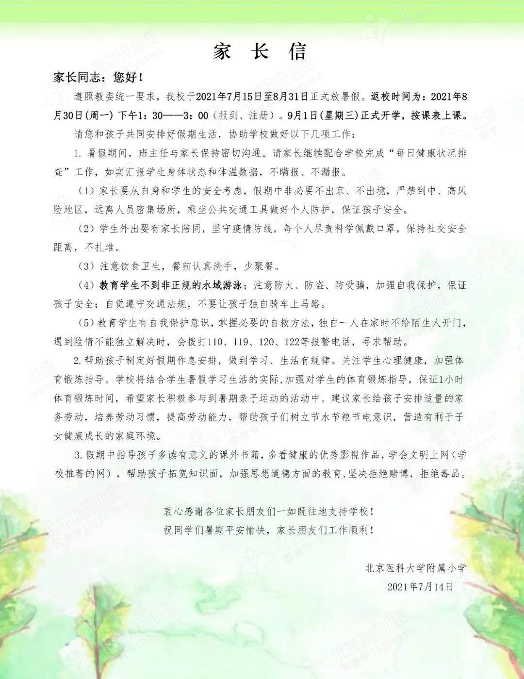 2021年西城区北京医科大学附属小学家长信公布!针对西城区北京医科大学附属小学暑期安排进行了说明,北京幼升小网团队为您分享相关内容。