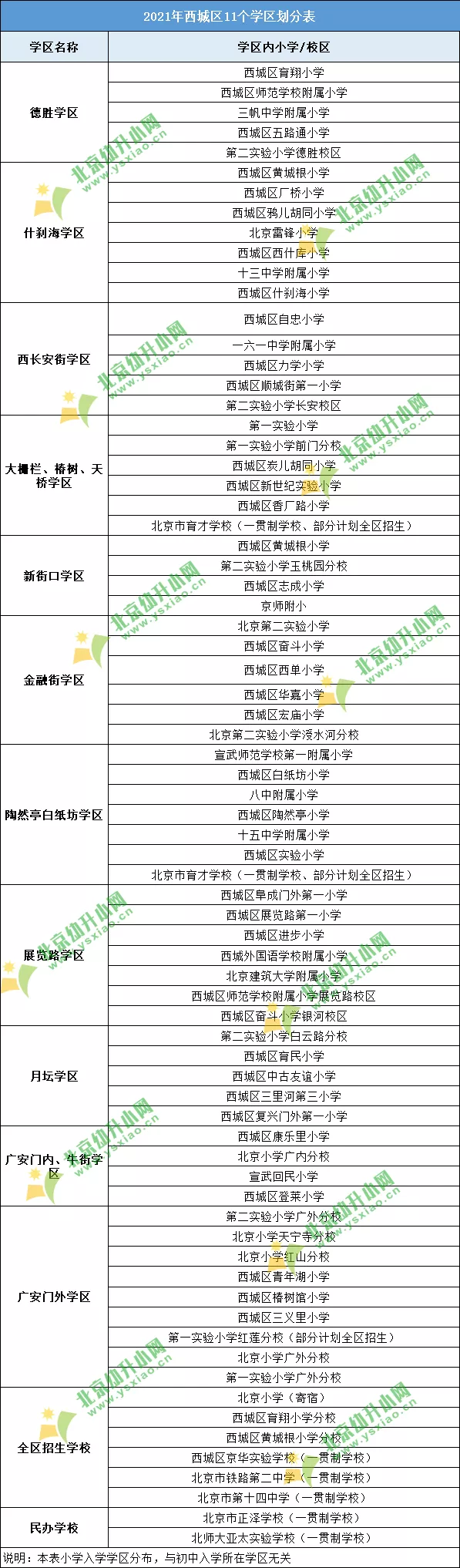 说明:西城区幼升小多校划片派位入学,主要依据就近原则在本学区或临学区及全区内,因此学区划分表是重要参考依据,以下内容根据2021年幼升小政策整理,仅供参考,具体请以入学当年实际要求为准。