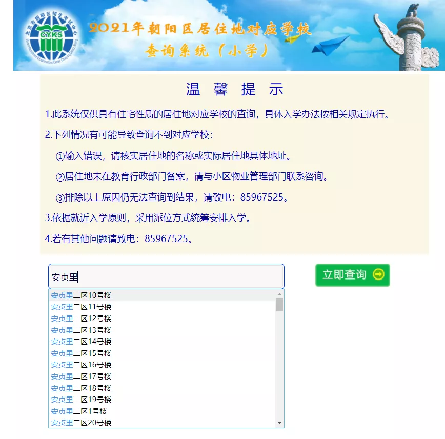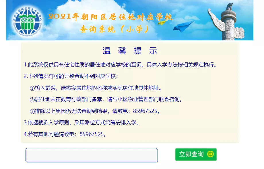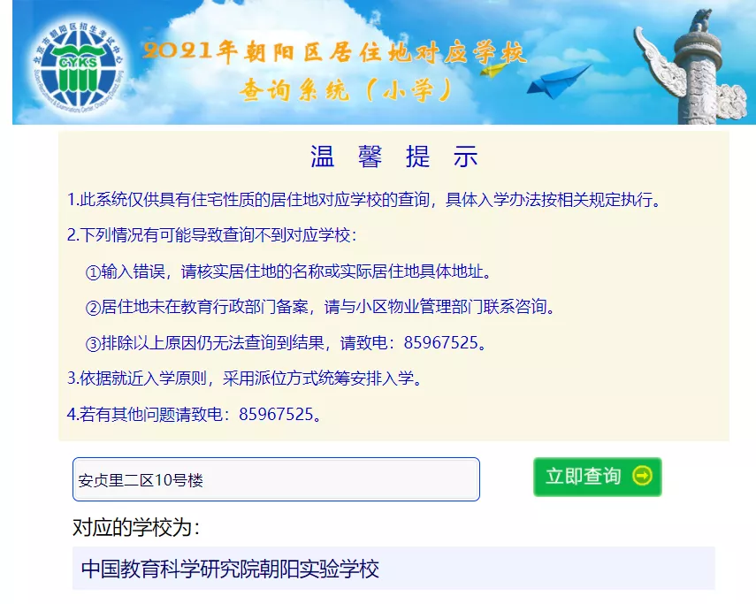 特别提醒:朝阳区2021年居住地对应学校查询系统(小学)现在还可查询,2022年家长也可输入居住地址进行查询,最终还请以入学当年实际情况为准。