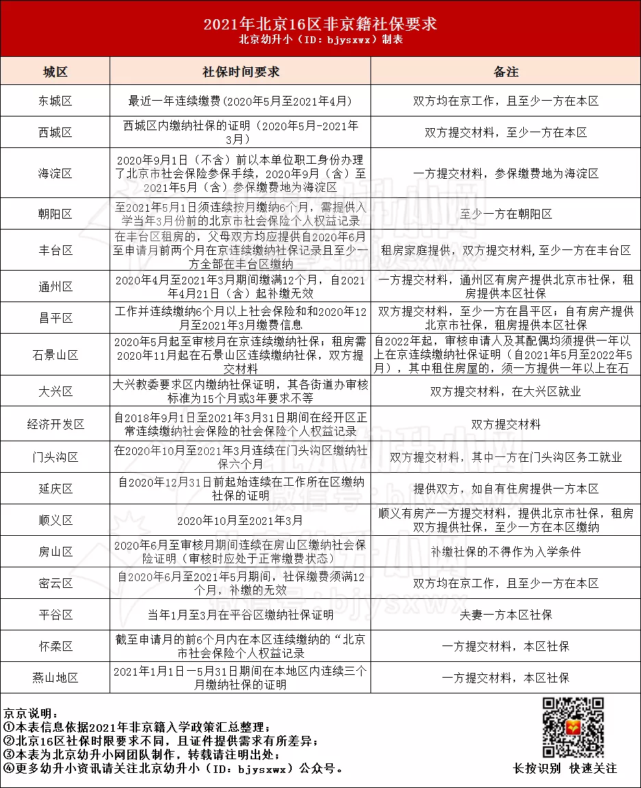 提醒:从上图中可以看出大部分城区要求半年以上社保,并且至少一方在本区缴纳,东城区要求社保满一年,经济技术开发区和大兴部分街道办,要求三年社保,因此对于2022及之后入学的家长,现在就要做好社保的核查工作啦!