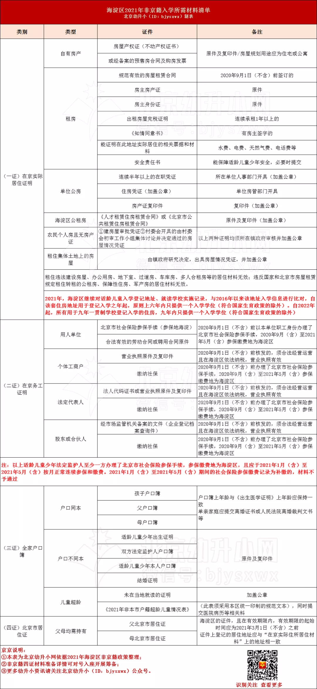 非京籍需提供四证材料入学,详细材料要求如下图所示:
