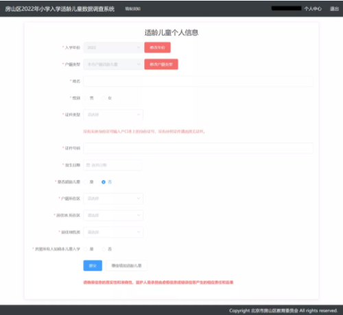根据按照提示填写儿童个人信息,填写完成后点击提交按钮。如有多个同一入学年份的儿童,可点击继续添加适龄儿童