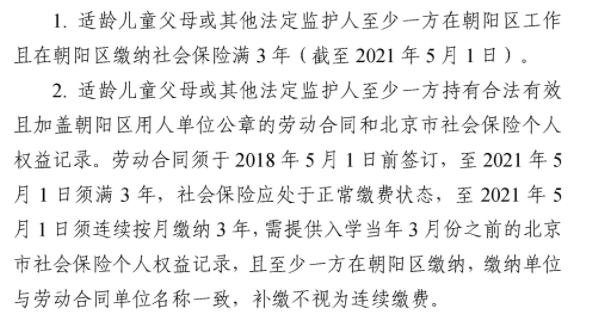 适龄儿童少年父母或其他法定监护人受雇于用人单位的审核标准:合法有效且加盖在京(至少一方在朝阳区)用人单位公章的劳动合同和北京市社会保险个人权益记录。劳动合同须于2020 年 11 月 1 日前签订,至 2021 年 5 月 1 日须满 6 个月,社会保险应处于正常缴费状态,至 2021 年 5 月 1 日须连续按月缴纳 6 个月,需提供入学当年 3 月份前的北京市社会保险个人权益记录,且至少一方在朝阳区缴纳,缴纳单位与劳动合同单位名称一致,补缴的不算连续按月缴费。