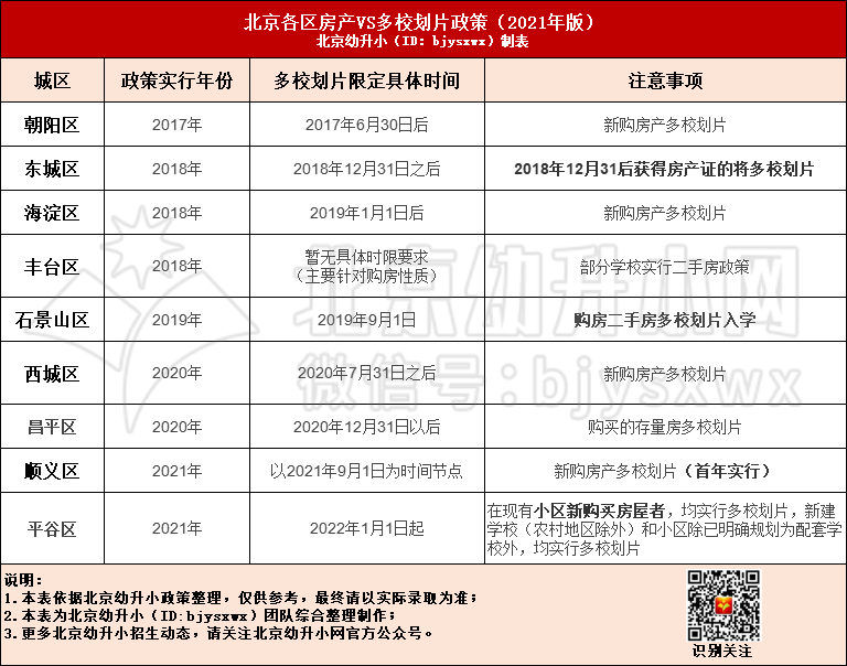 从2021年入学政策来看,有部分区明确提出超过购房时间,将以多校划片的方式入学,如下: