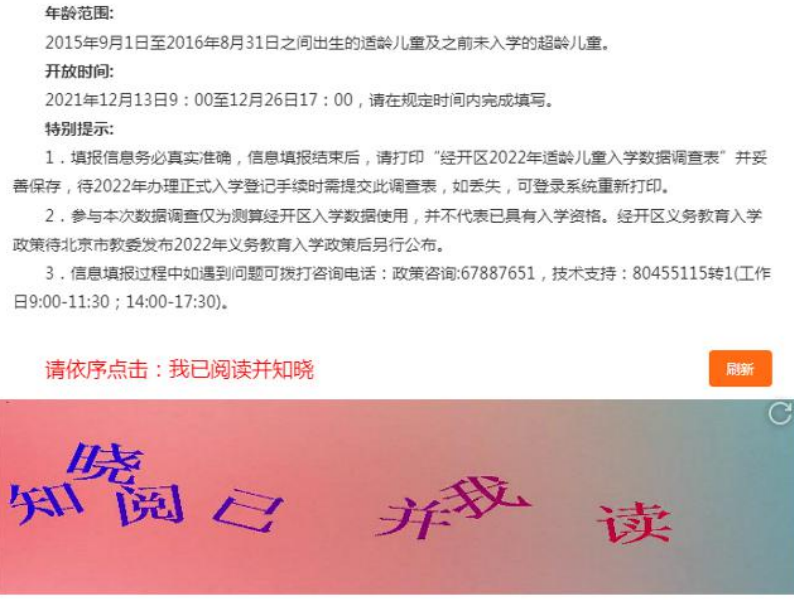 注意:若“我已阅读并知晓”七个字点击顺序错误,则可点击【刷新】按钮进行刷新,刷新后可重新点击。