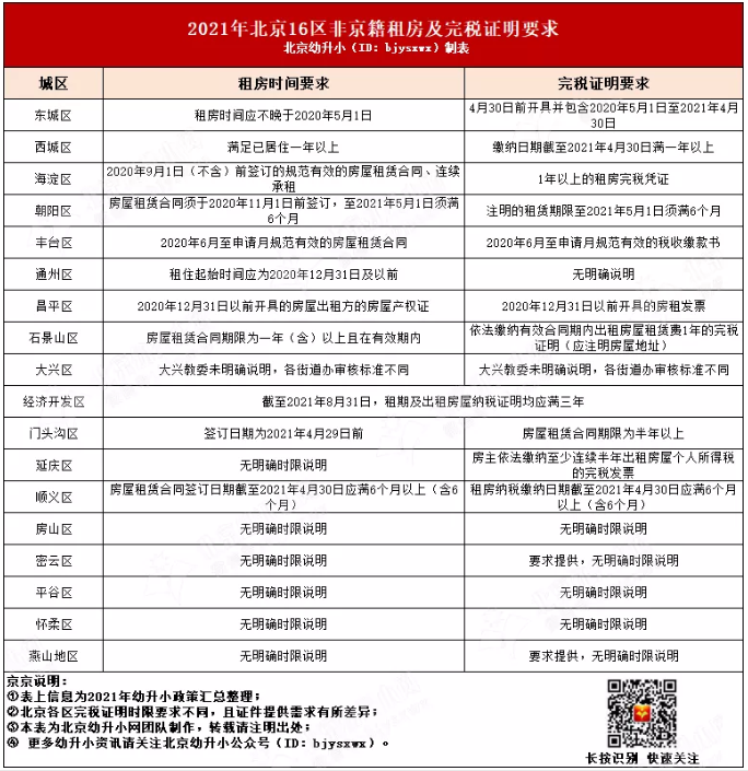 参考2021年政策来看,京京整理了各区非京籍幼升小租房完税证明时间要求如下: