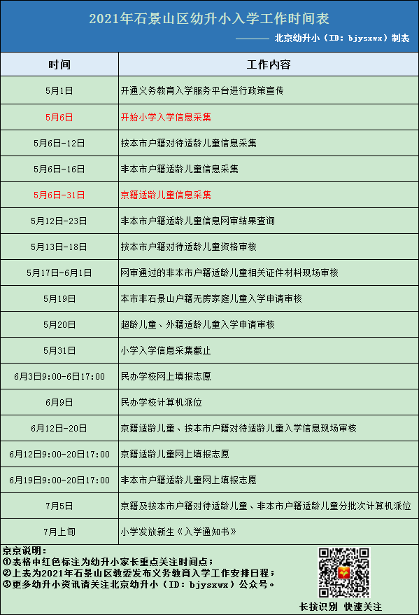2022年石景山区幼升小家长请注意,什么时候发布政策,什么时候进行信息采集?各区的入学日程安排是怎样的?北京幼升小网团队(ID:bjysxwx)为你整理了相关内容。