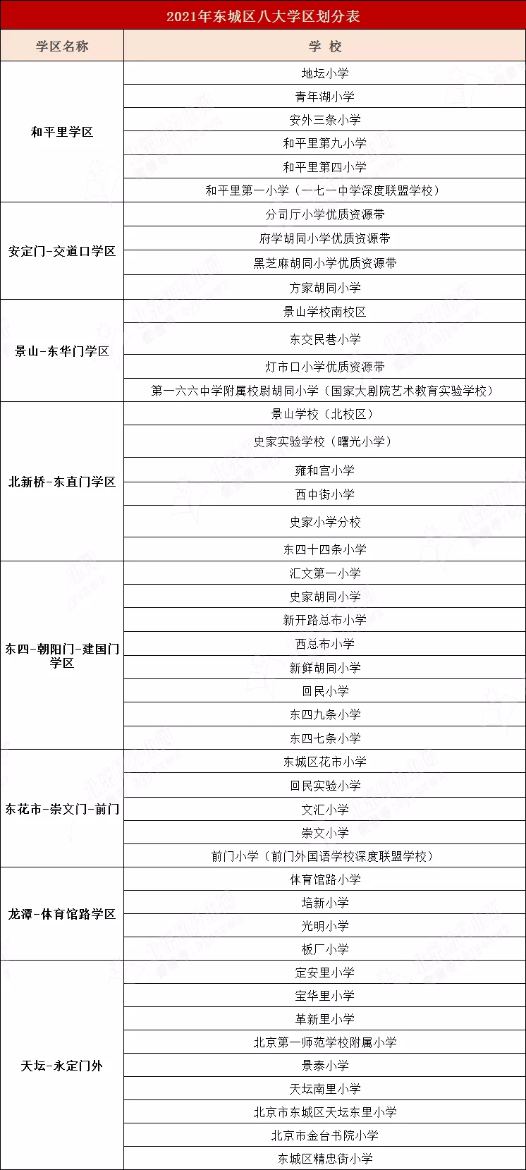 提醒:东城区2021年仍为8个学区,学区内小学名单如上图所示,大家可查看对应学区所在小学,此外,东城区有自己的划片查询系统(目前为2021年系统)