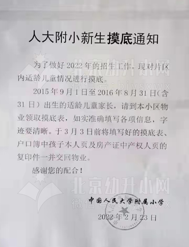 2022年幼升小海淀区人大附小新生摸底调查通知发布,各位家长您知道2022年幼升小海淀区人大附小新生摸底调查时间是什么时候?北京幼升小网为您分享相关内容。
