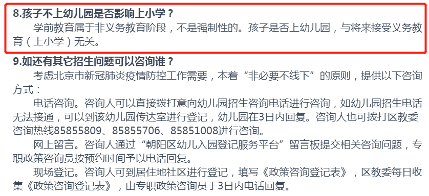 在北京上学的家长注意啦,据2021年朝阳区幼儿园入园登记问答上明确指出:学前教育属于非义务教育阶段,不是强制性的。孩子是否上幼儿园,与将来接收义务教育无关,如下图: