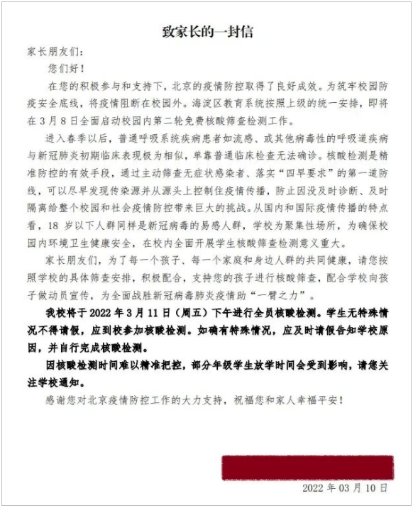 近期多位海淀区的家长接到了学校发出的通知,海淀区教育系统按照上级的统一安排,海淀全面启动校园内第二轮免费核酸筛查检测工作。