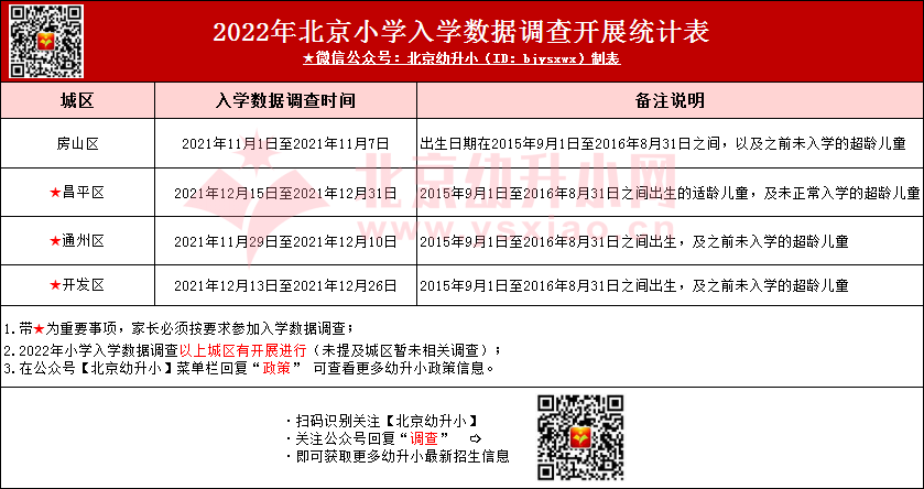 2023年入学家长注意,2022年开展小学入学数据调查的城区主要有昌平、通州等区,如下所示:
