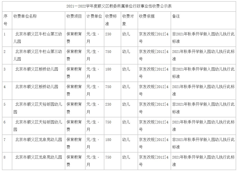 2021—2022学年度顺义区教委所属单位行政事业性收费公示