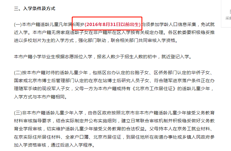北京市义务教育入学政策中明确指出:年满6周岁(2016年8月31日以前出生)的适龄儿童,具体如下图: