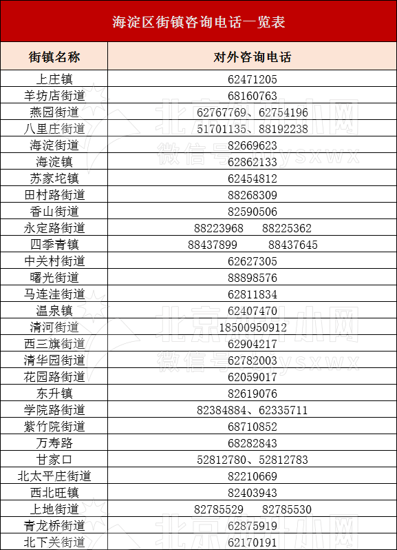 2022幼升小家长注意,北京幼升小网团队整理了海淀区街镇咨询电话一览表,需要的家长赶紧收藏!