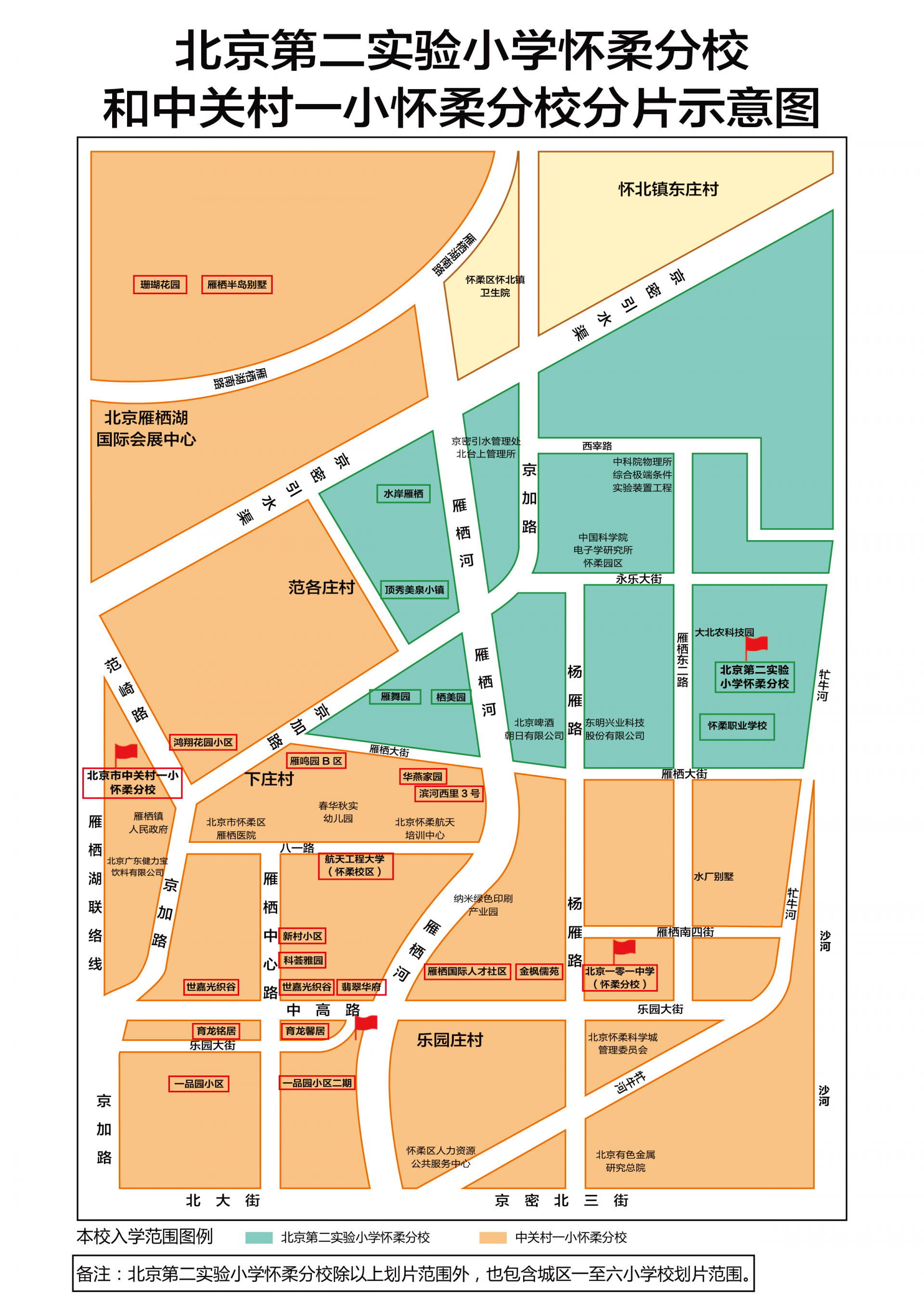 北京第二实验小学怀柔分校和中关村一小怀柔分校分片示意图