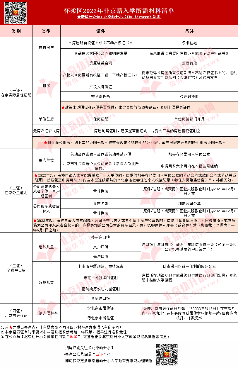 怀柔区2022年幼升小非京籍入学材料审核标准