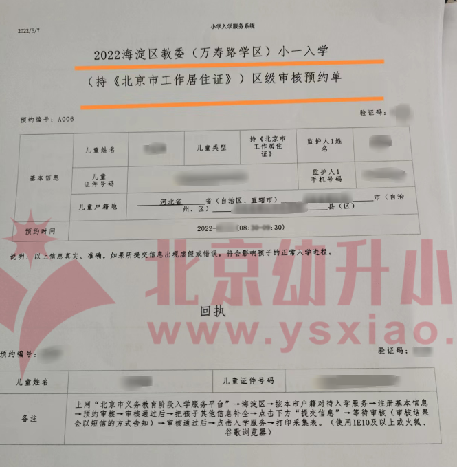 2022年幼升小海淀区万寿路学区小一入学区级审核预约单(持北京市工作居住证)