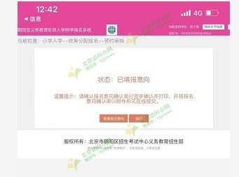 2022年朝阳区幼升小信息采集志愿填报意向提醒页面