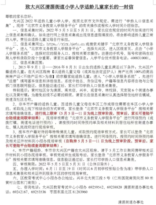 2022年大兴区清源街道办小学入学适龄儿童的一封信