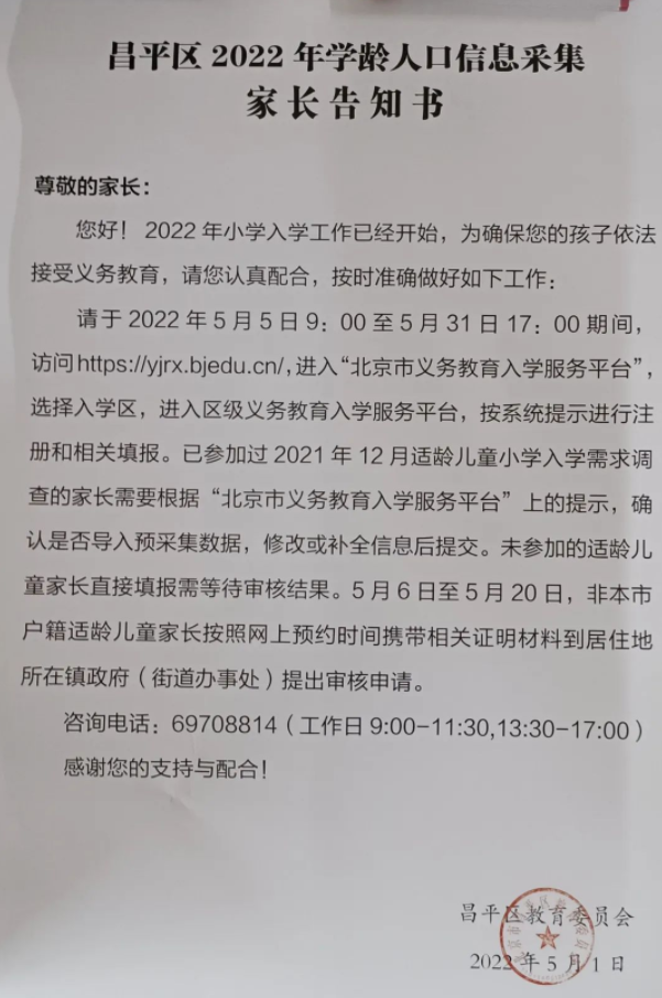 2022年幼升小工作将于5月5日开启线上预约,5月6日开始线下提交”四证“材料,地点在北七家镇企业服务中心。