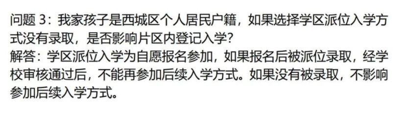 从上述教委回应我们可看出:如京籍适龄儿童参加西城区学区派位,未被录取,可继续参加后续入学方式。如学区派位顺利录取,则不能继续参加后续入学报名。