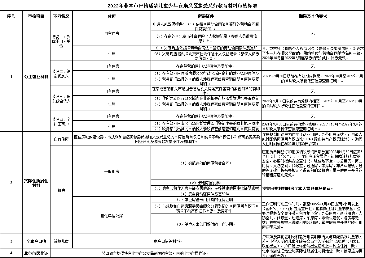 2022年非本市户籍适龄儿童少年在顺义区接受义务教育材料审核标准