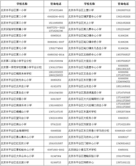 2022 年平谷区小学招生咨询电话