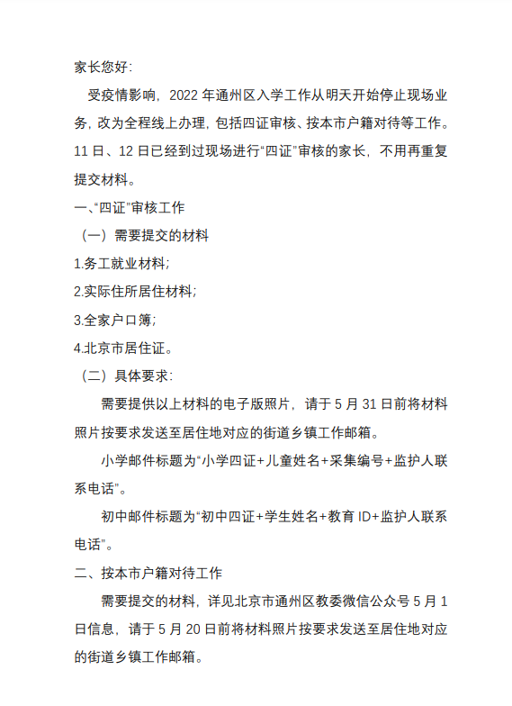 家长您好,受疫情影响,通州区入学工作从明天开始停止现场业务,改为全程线上办理,包括四证审核、按本市户籍对待等工作。具体要求请登录“北京通州教育咨询”平台 http://zxzx.bjtzeduyun.com/,按通知要求提交相关材料。11日、12日已经到过现场进行“四证”审核的家长,不用再重复提交材料。