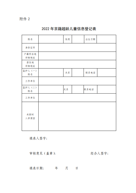 根据2022年门头沟区幼升小入学政策,门头沟区京籍超龄儿童幼升小审核材料时需要提供以下登记表,请各位家长下载填写: