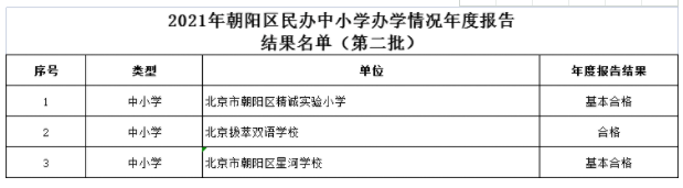 根据北京市朝阳区教委2021年年度报告工作安排,现将民办中小学第二批3所年检结果及要求公告如下: