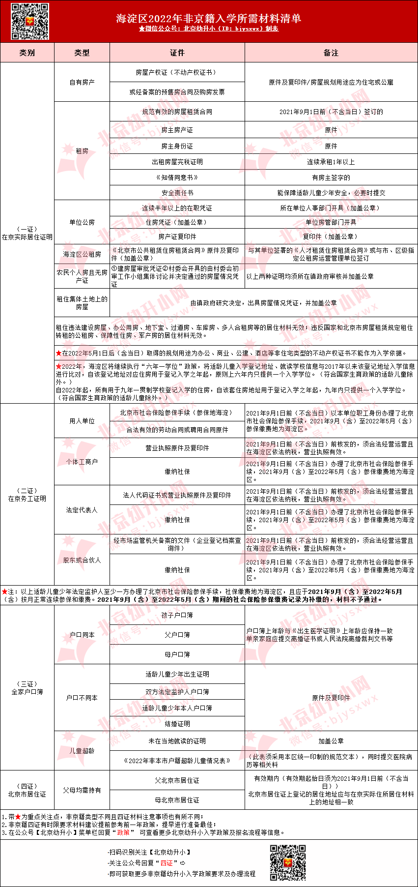 温馨提示:2023年幼升小政策将集中在2023年四月发布!因部分非京籍入学材料有时间城区限制,需要提前准备,以下海淀区非京籍四证材料要求为2022年政策,仅供参考。