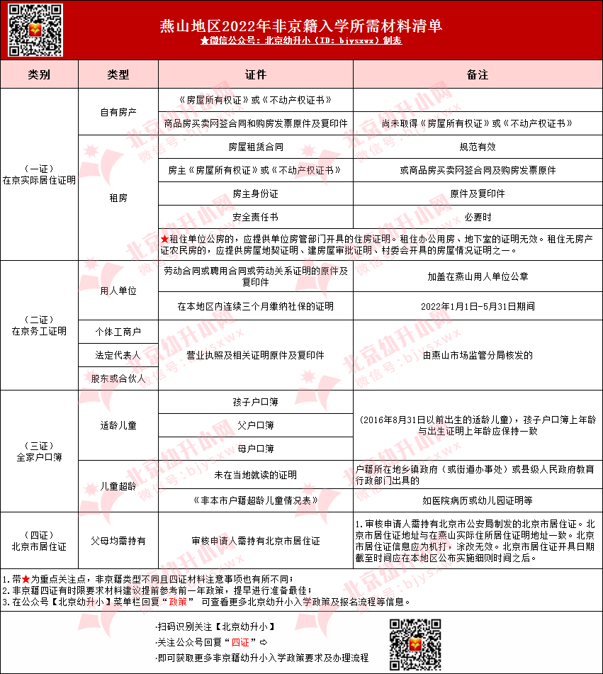 温馨提示:2023年幼升小政策将集中在2023年四月发布!因部分非京籍入学材料有时间城区限制,需要提前准备,以下燕山地区非京籍四证材料要求整理自《2022年燕山地区非本市户籍适龄儿童少年入学审核实施细则》,仅供参考。