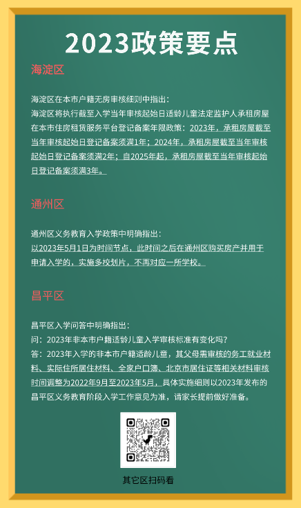 提醒:从目前已发布政策来看,多区公布了2023年入学要求,其中主要是针对非京籍材料、多校划片政策等。