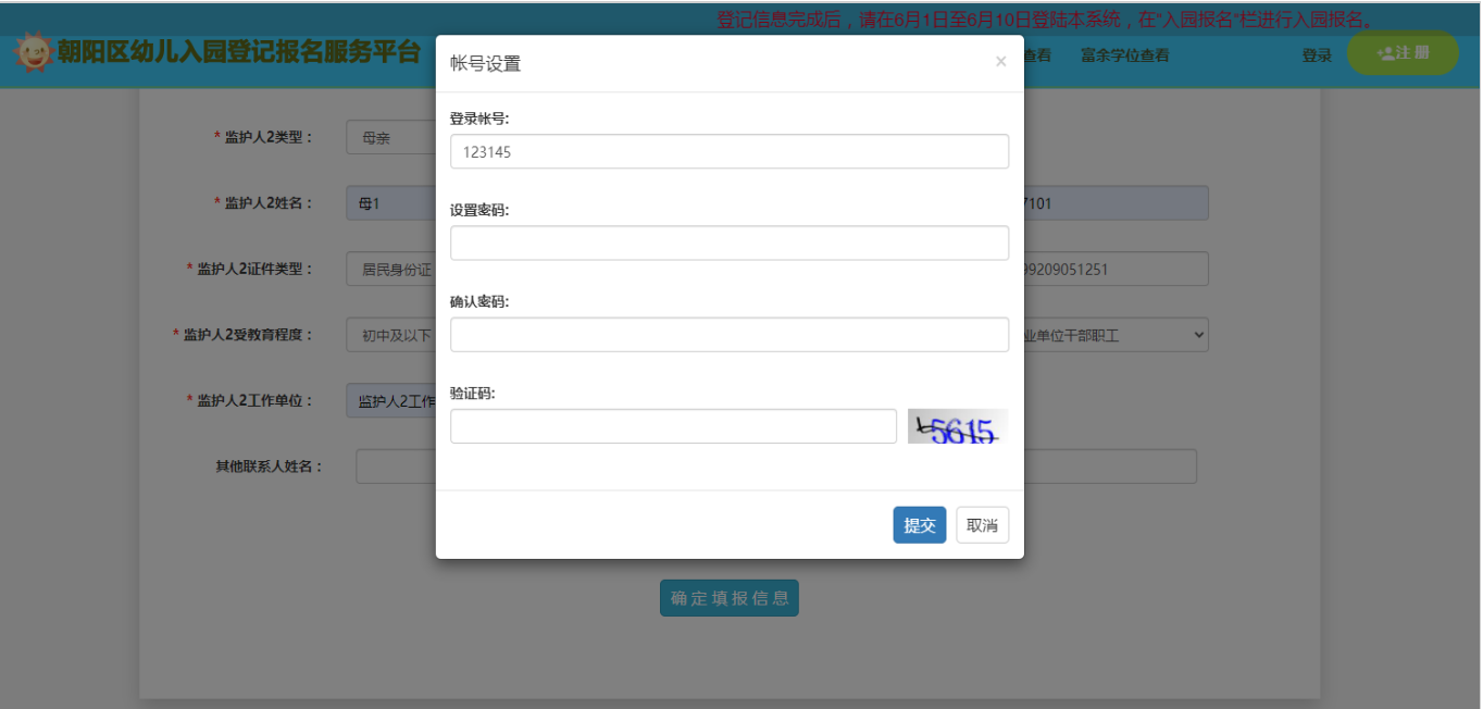 阅读家长须知填写登记信息生成账号、设置密码提交成功