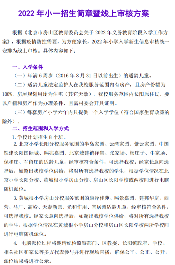 2022年幼升小家长满足条件需按要求在指定时间内前往小学登记,入学按房山区长阳学校招生简章要求进行小学报名。更多小学招生简章,可查看:2022年北京16区小学招生简章汇总。