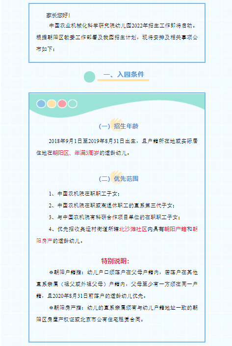 中国农业机械化科学研究院幼儿园2022年招生工作即将启动。根据朝阳区教委工作部署及我园招生计划,现将安排及相关事项公布如下: