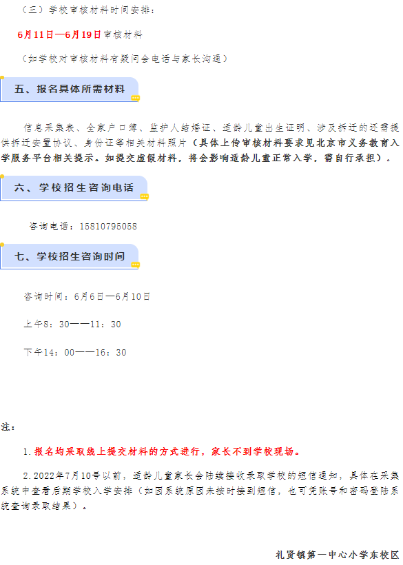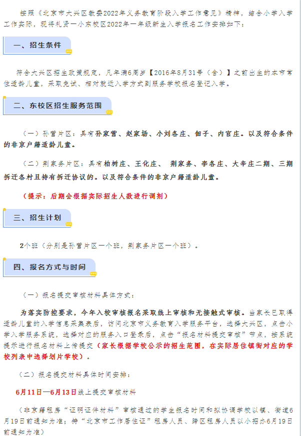 按照《北京市大兴区教委2022年义务教育阶段入学工作意见》精神,结合小学入学工作实际,现将礼贤一小东校区2022年一年级新生入学报名工作安排如下: