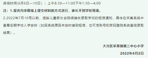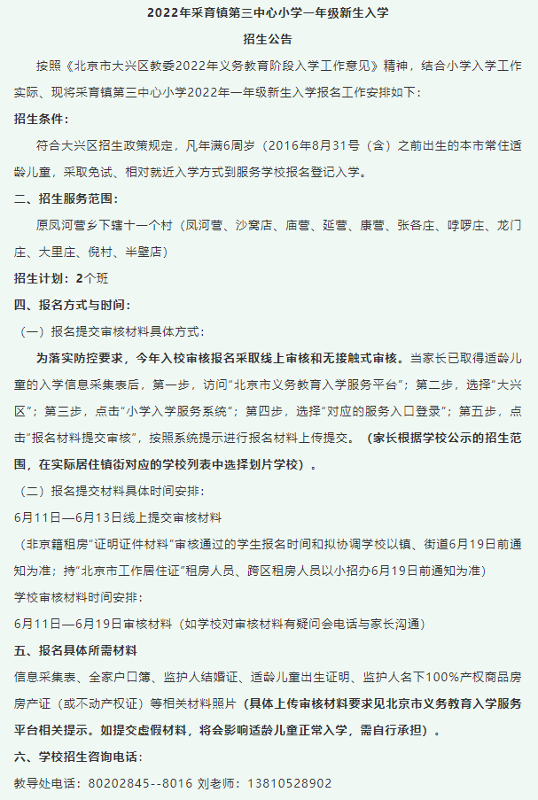 按照《北京市大兴区教委2022年义务教育阶段入学工作意见》精神,结合小学入学工作实际、现将采育镇第三中心小学2022年一年级新生入学报名工作安排如下: