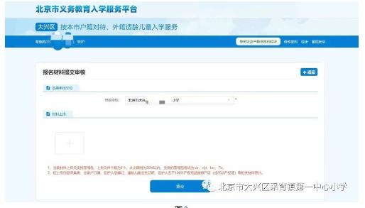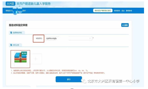 5、选择审核学校【北京市大兴区采育镇第一中心小学】,并上传审核证件压缩文件包,点击提交。如图4: