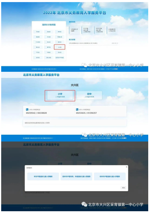 1、登录北京义务教育入学服务平台,选择【大兴区】,点击【小学入学服务系统】,选择对应的学生类型,登录系统。