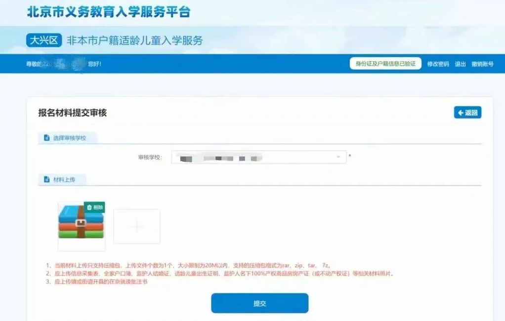 参照大兴区第二小学入学公告中的说明,将审核材料拍照(照片均为原件拍摄,垂直拍摄,拍摄画面内容完整,保证字迹清晰可见,原件贴合拍摄画面边缘,拍摄清晰明亮),所有图片放在一个文件夹,以“学生姓名+联系方式”进行命名,压缩后在平台进行上传。(压缩包不能超过20M)