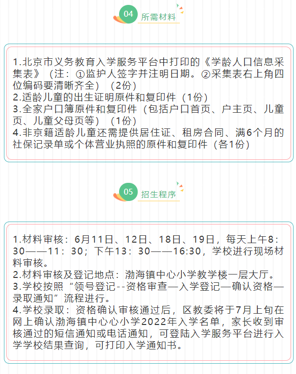 4.学校录取:资格确认审核通过后,区教委将于7月上旬在网上确认渤海镇中心心小学2022年入学名单,家长收到审核通过的短信通知或电话通知,可登陆入学服务平台进行入学学校结果查询,可打印入学通知书。