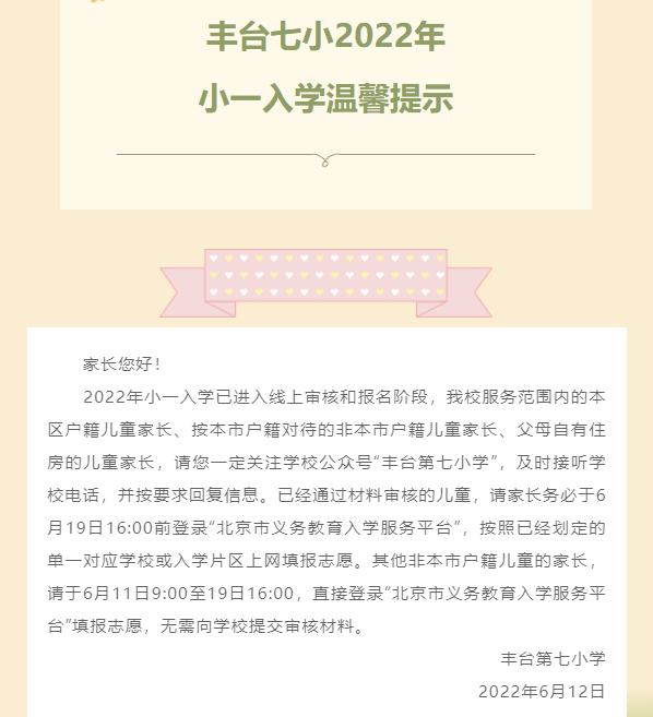 2022年小一入学已进入线上审核和报名阶段,我校服务范围内的本区户籍儿童家长、按本市户籍对待的非本市户籍儿童家长、父母自有住房的儿童家长,请您一定关注学校公众号“丰台第七小学”,及时接听学校电话,并按要求回复信息。已经通过材料审核的儿童,请家长务必于6月19日16:00前登录“北京市义务教育入学服务平台”,按照已经划定的单一对应学校或入学片区上网填报志愿。其他非本市户籍儿童的家长,请于6月11日9:00至19日16:00,直接登录“北京市义务教育入学服务平台”填报志愿,无需向学校提交审核材料。