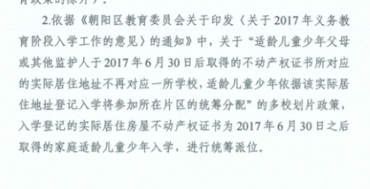 今年政策中重申,从2017年起,朝阳区对适龄少年儿童少年入学登记的实际居住地址实施记录管理,实际居住地址用于登记入学之年起,原则上小学六年内、初中三年内只提供实际居住地址服务范围内的一个入学学位(符合国家生育政策的除外)。