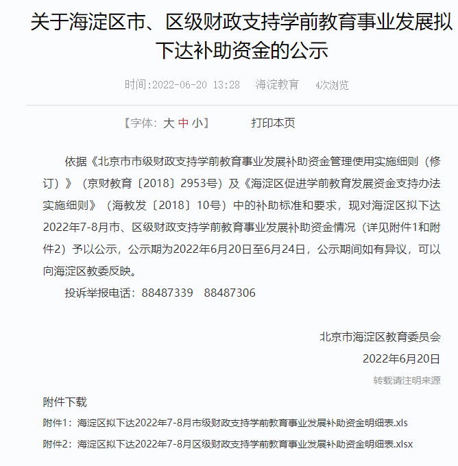 依据《北京市市级财政支持学前教育事业发展补助资金管理使用实施细则(修订)》(京财教育〔2018〕2953号)及《海淀区促进学前教育发展资金支持办法实施细则》(海教发〔2018〕10号)中的补助标准和要求,现对海淀区拟下达2022年7-8月市、区级财政支持学前教育事业发展补助资金情况(详见附件1和附件2)予以公示,公示期为2022年6月20日至6月24日,公示期间如有异议,可以向海淀区教委反映。