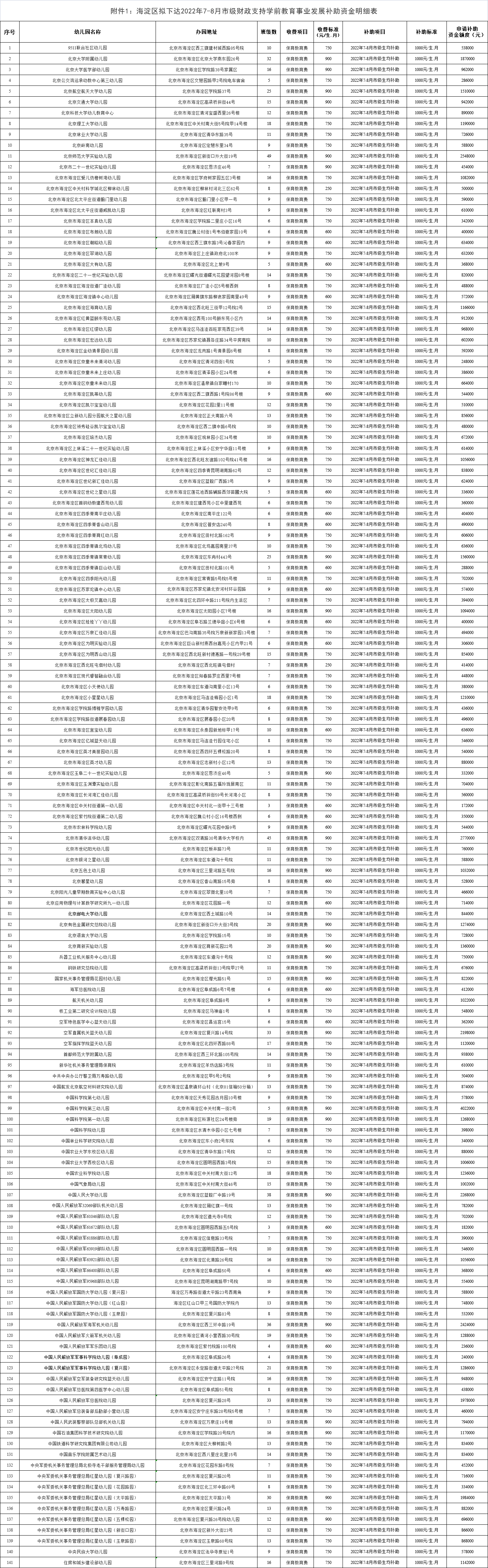 海淀区拟下达2022年7-8月市级财政支持学前教育事业发展补助资金明细