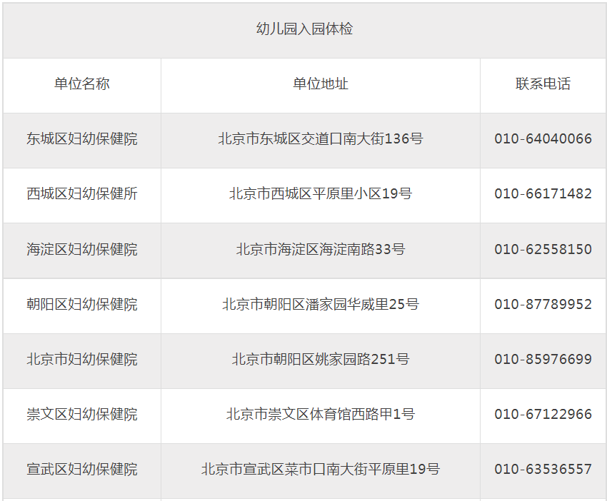 一般幼儿园体检是在各区妇幼保健院或幼儿园指定医院进行的,各城区要求不一样,下面北京幼升小网为您整理分享北京各城区入园体检单位及地址,供大家参考: